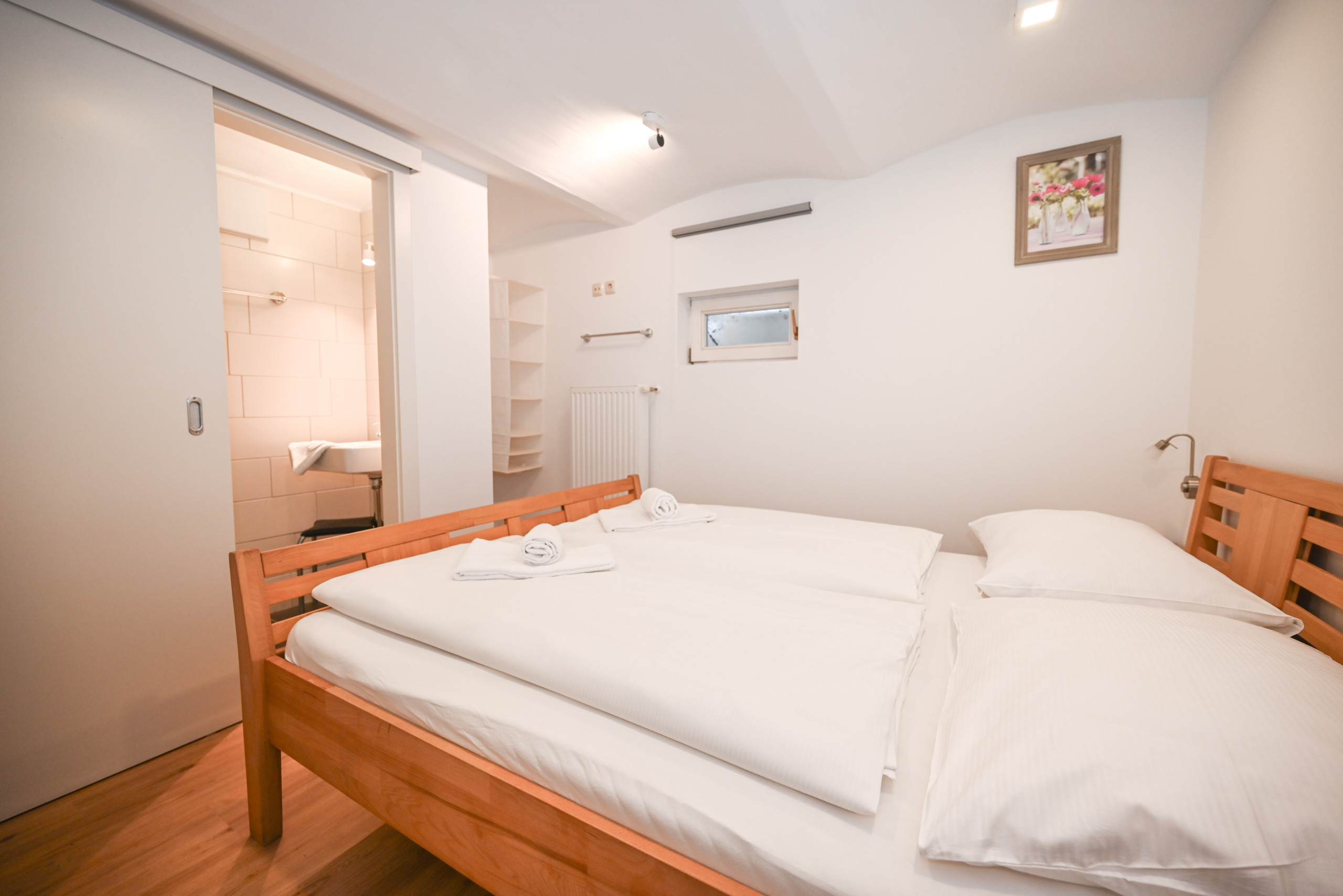 - Zwei Schlafzimmer mit Doppelbett und jeweils eigenem Badezimmer (Dusche)